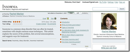 As always, a picture is worth a thousands words, so an example of a knol is below (click on the image twice to see the page in full). The main content is real, and we encourage you to read it (you may sleep better afterwards!), but most of the meta-data -- like reviews, ratings, and comments -- are not real, because, of course, this has not been in the public eye as yet. Again, this is a preliminary version."