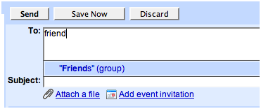 The great thing about creating contact groups is that they "auto-complete": you can type the group name as you normally would type email addresses or contact names, and by selecting the group from the drop down menu, the group's contacts are automatically inserted. Your email recipients will not see your group name when they receive the email, but instead will see all the individual contact names and email addresses listed as normal.
