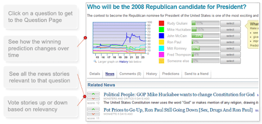 Hubdub forecasts how news stories will turn out. Use it to track the stories you care about and compete with others by making predictions yourself.