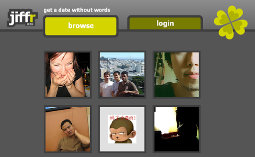 Know what a blind date is? jiffr is the opposite. Pick nine photos from your flickr account to describe yourself. Browse other users photos and choose the ones you wanna date. There's no way to talk before you meet each other. No instant messaging, no chat, no mail. No words at all. Just photos.