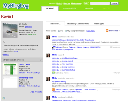 There are couple of changes made to the MyBlogLog recently. First of all, profiles are refreshed. If you have logged to your account, you probably find it at first glance. Profile view is changed. The new feature that they have announce recently called "New with Me" is not live with each profile.