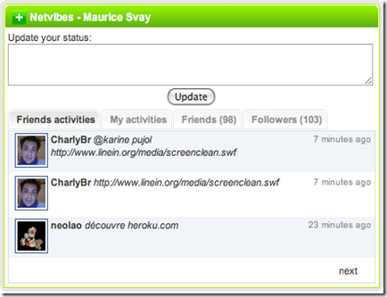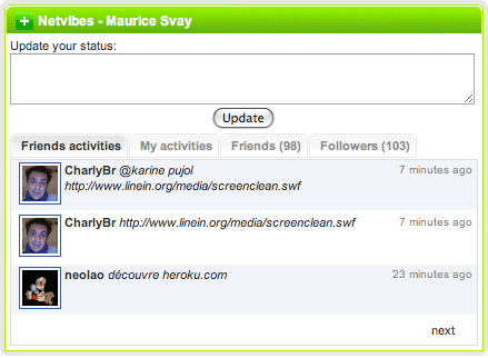 1. Activities Widget : Just like the twitter and facebook widgets, you can check what your friends are up to with one handy widget. It also allows you to change your status to quickly answer your friends. To add it, simply drag'n'drop your avatar from your Profile to your page.