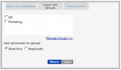 You can now share documents with groups. This makes it a lot easier to share documents with multiple people avoiding entering of multiple email addresses each time you share a document. To share a document with a group, click on ‘Share’ and select the ‘Share with Groups’ tab. You can create new groups in your ‘My Account‘ section. These groups will be visible across all Zoho Applications.
