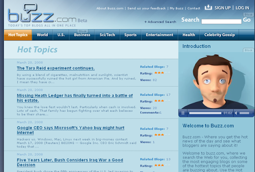 To make your experience even more entertaining, buzz.com brings the summary story to life through advanced 3-D imaging and speech synthesis via animated “buzzcasts”. Simply click on the buzz icon to hear a story performed by one of the buzzcasters.