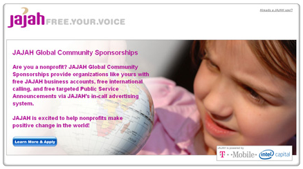 Are you a nonprofit? JAJAH Global Community Sponsorships Program provide organizations like yours with free JAJAH business accounts, free international calling, and free targeted Public Service Announcements via JAJAH's in-call advertising system.