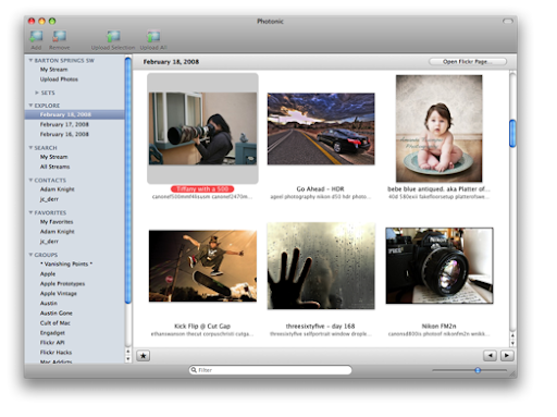 In addition to letting you upload your photos in an easy and Mac-like fashion (complete with snappy, snazzy, and non-gratuitous Core Animation feedback), Photonic is also a Flickr browser. Keep track of your contacts, groups, and even the past several days in Explore, all from Photonic. When you care to interact with a photo, right-click on it and you can be taken straight to the page on Flickr where you can read and leave comments as usual. Photonic enhances your already-excellent Flickr experience.